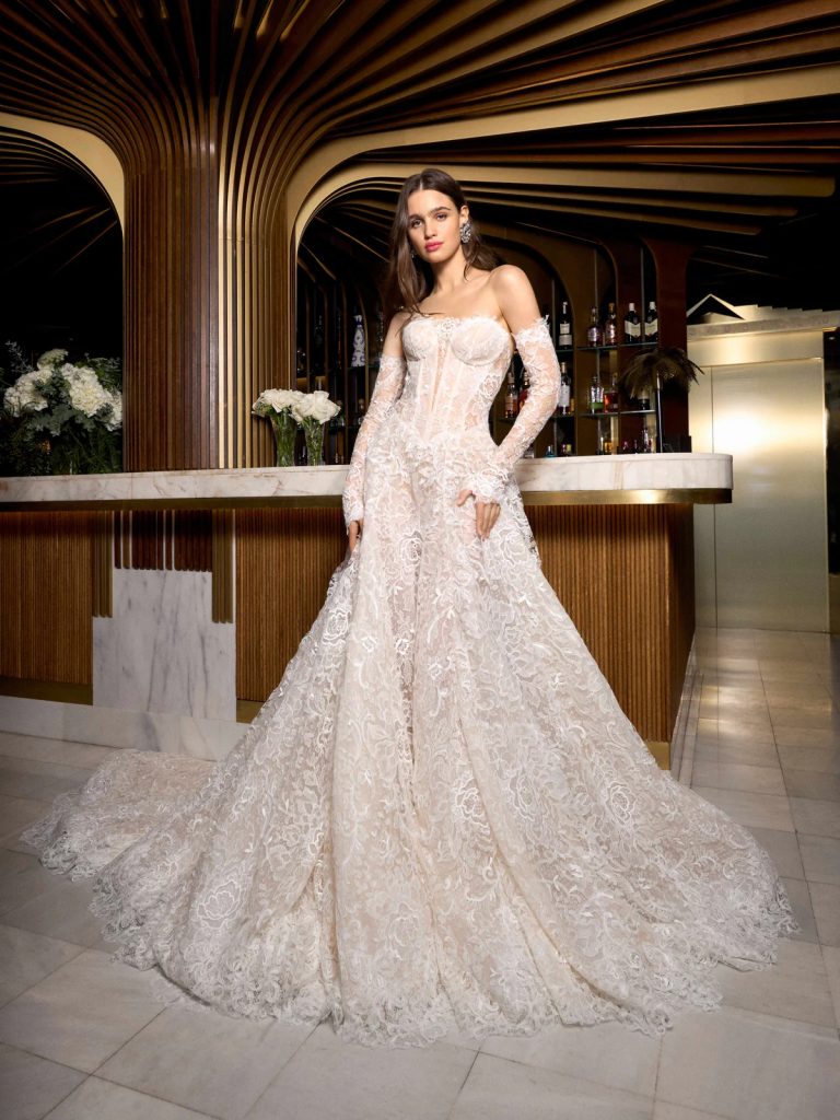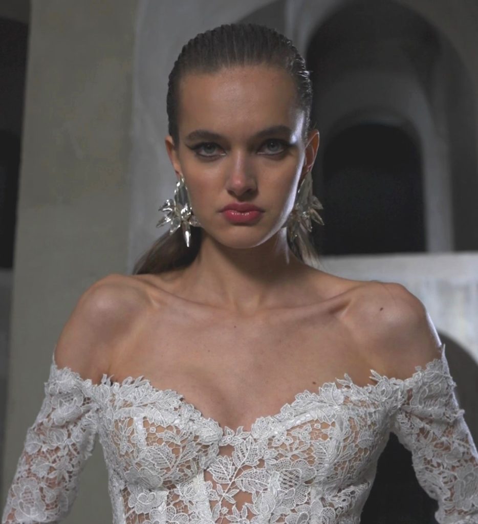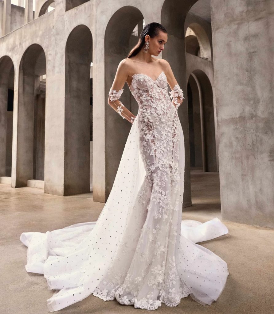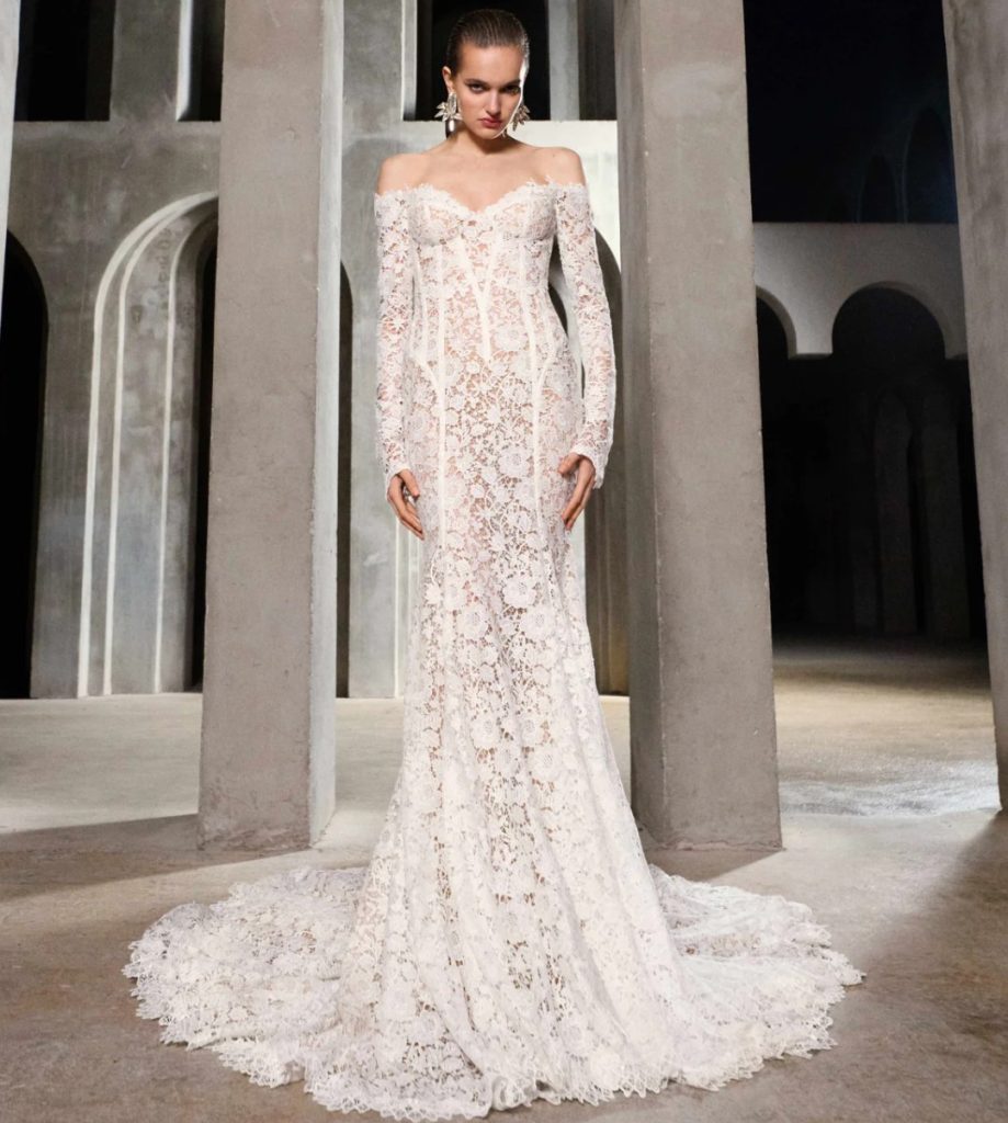 Ancora trionfo in pizzo con “Hermosa”, “una poesia vintage in pizzo integrale raccontata in forma di statuario abito a sirena”, racconta il brand. Lo scollo alto e le maniche complete su misura rendono questo look senza tempo raffinato e sofisticato.