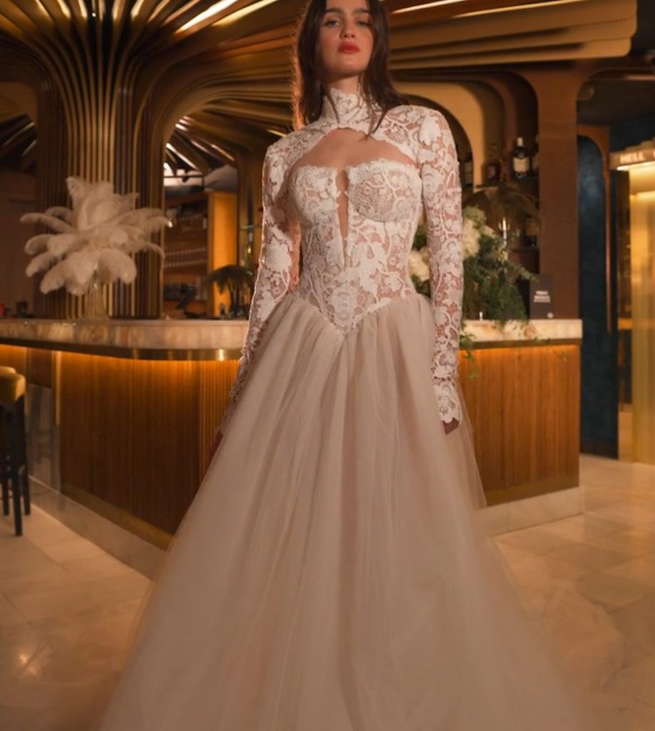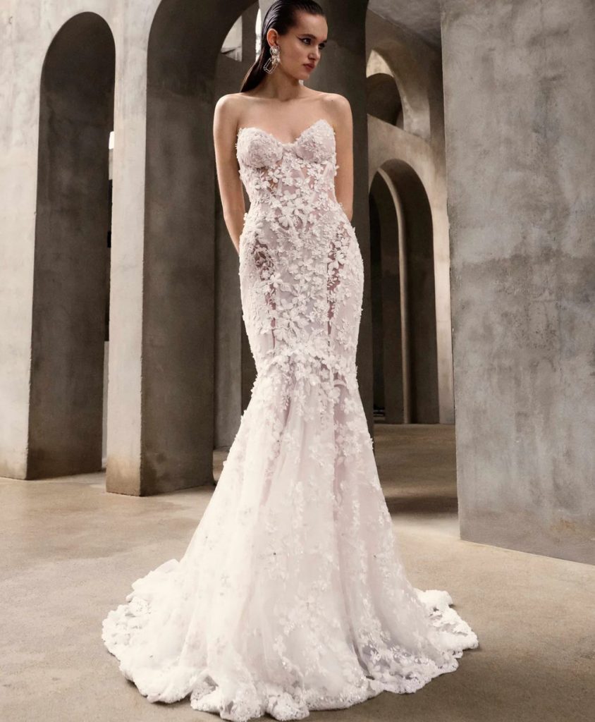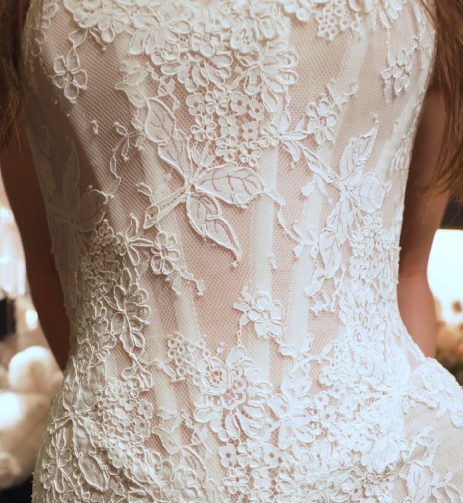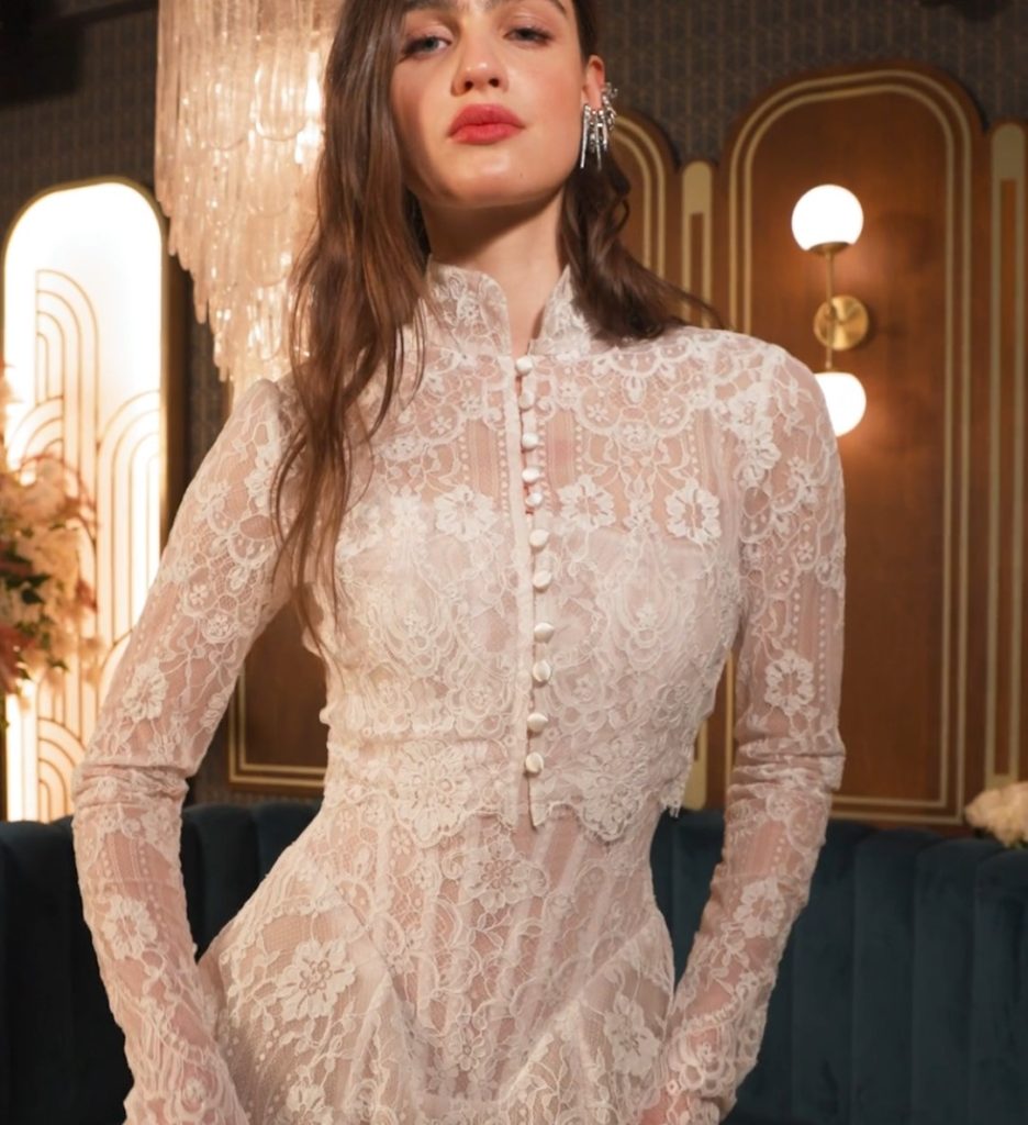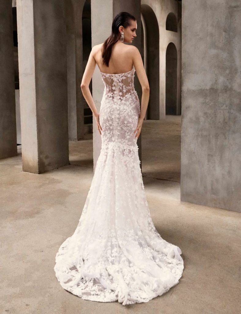 Ancora trionfo in pizzo con “Hermosa”, “una poesia vintage in pizzo integrale raccontata in forma di statuario abito a sirena”, racconta il brand. Lo scollo alto e le maniche complete su misura rendono questo look senza tempo raffinato e sofisticato.