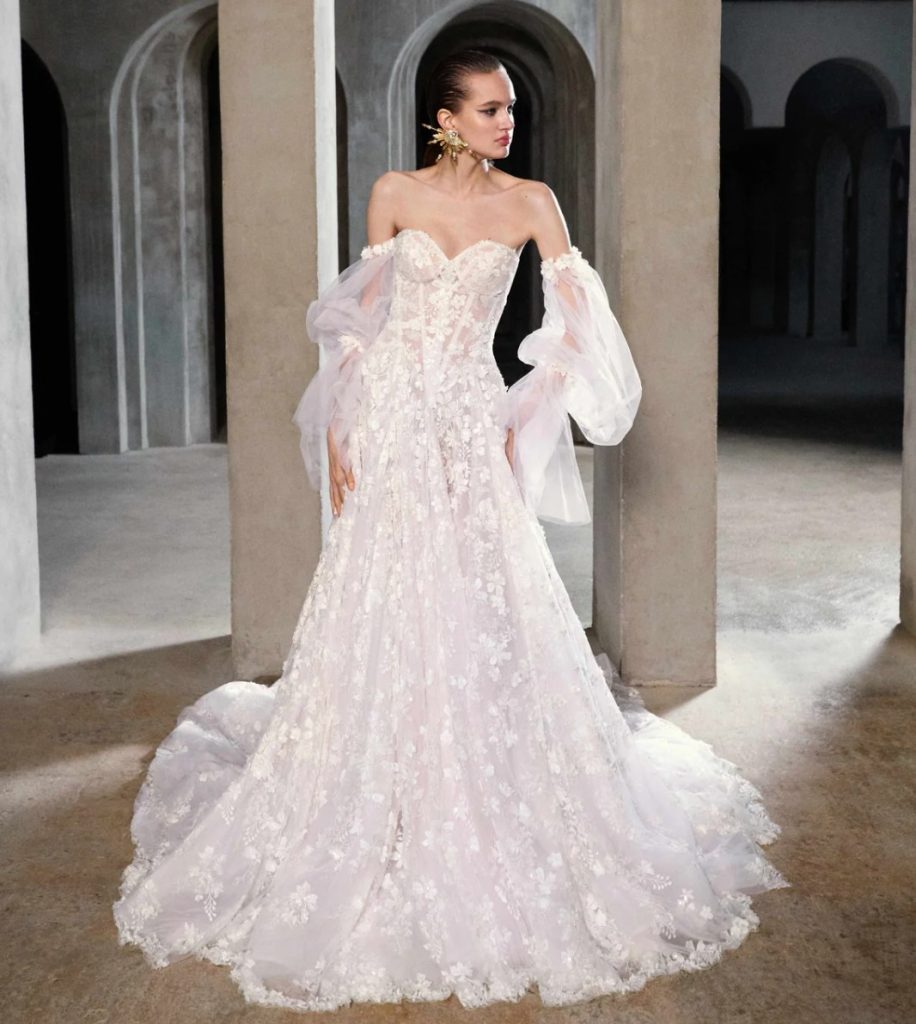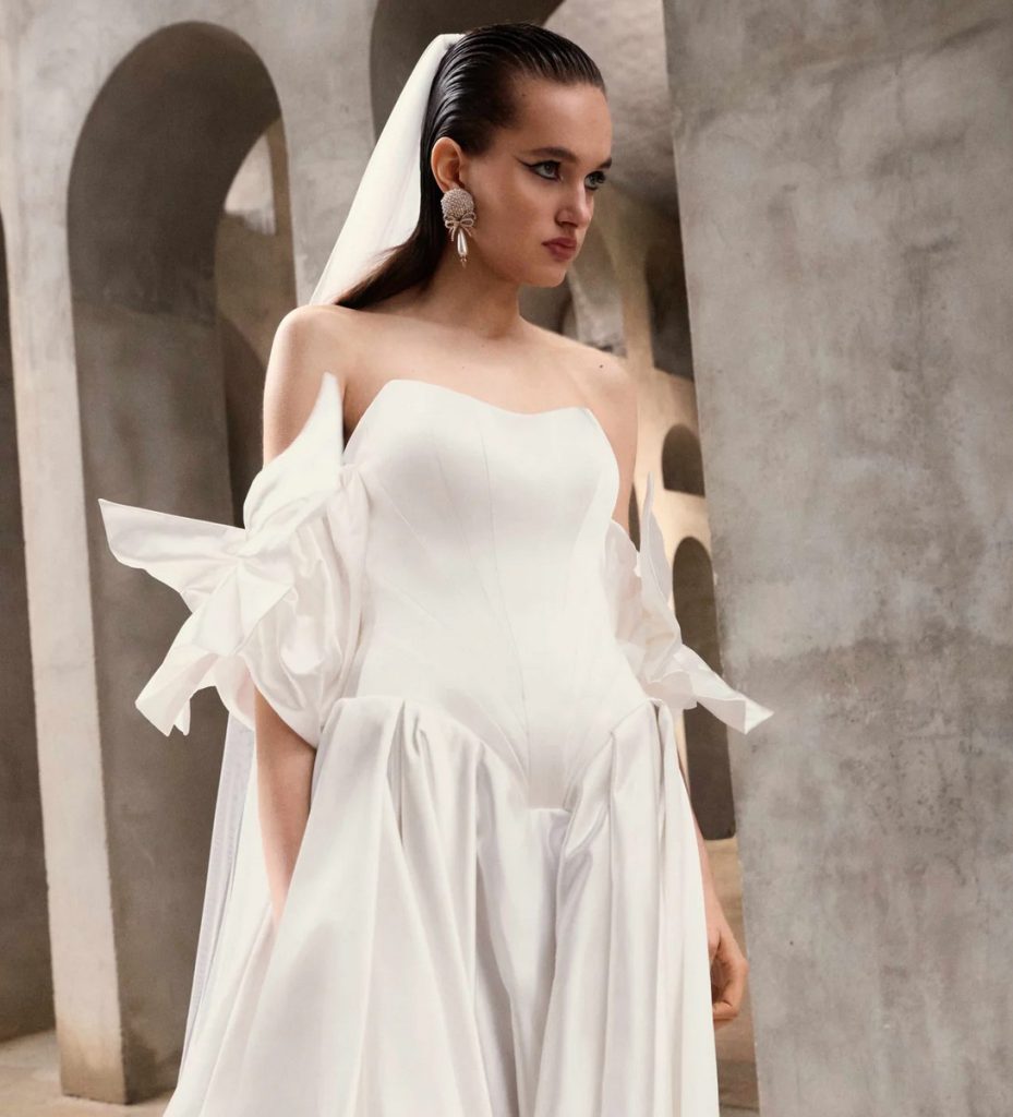 Focus sulle maniche per l’abito da sposa “Martini”, dalla collezione sposa Galia Lahav Gala Spring 2026: “Ispirato all'eleganza di un bicchiere di Martini – spiega il brand -  questo abito brinda al pizzo con il suo corsetto strutturato e semitrasparente e la gonna voluminosa e giocosa. Un perfetto connubio tra raffinatezza e civetteria”.