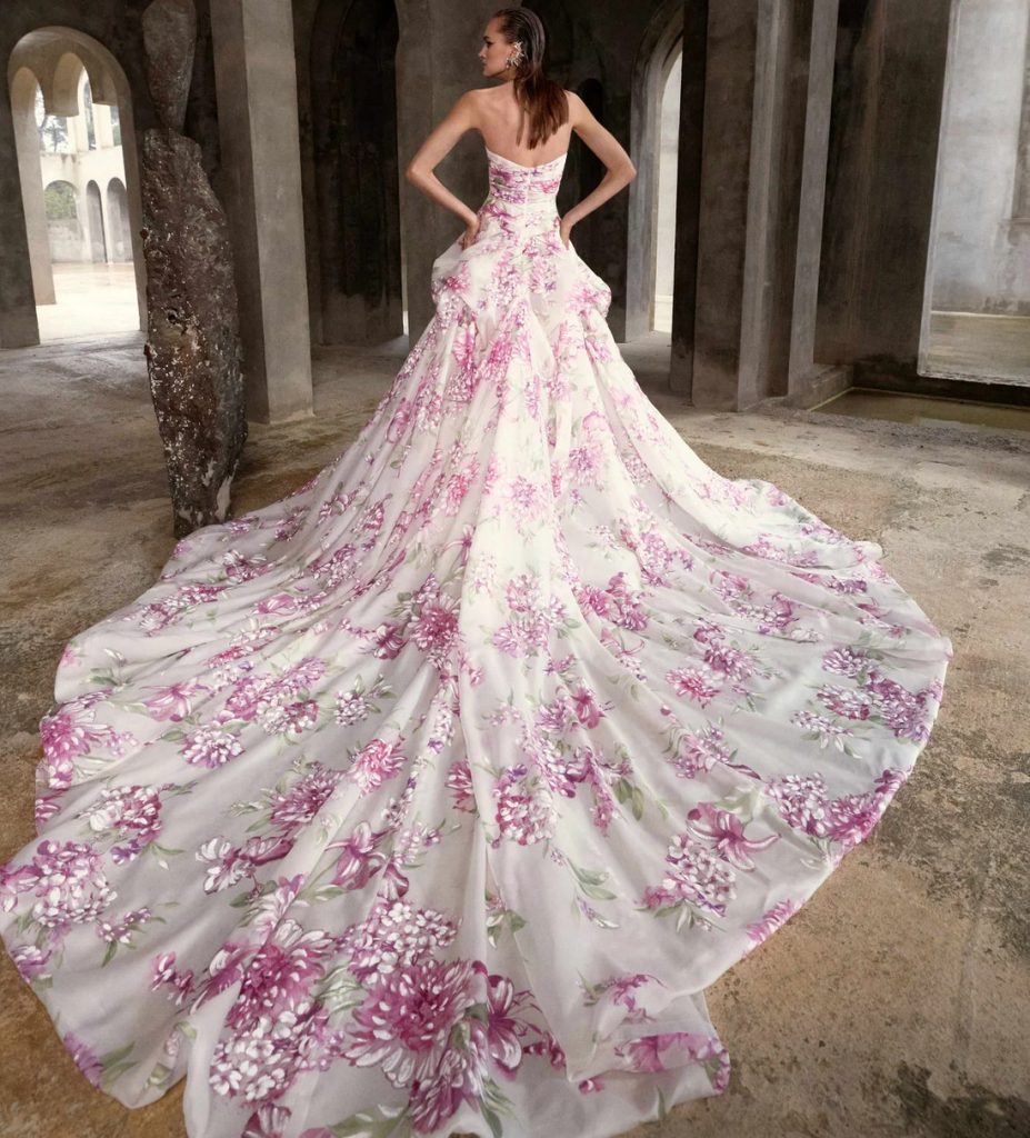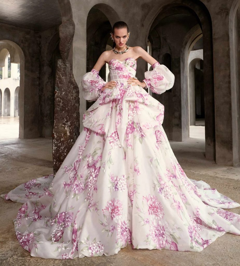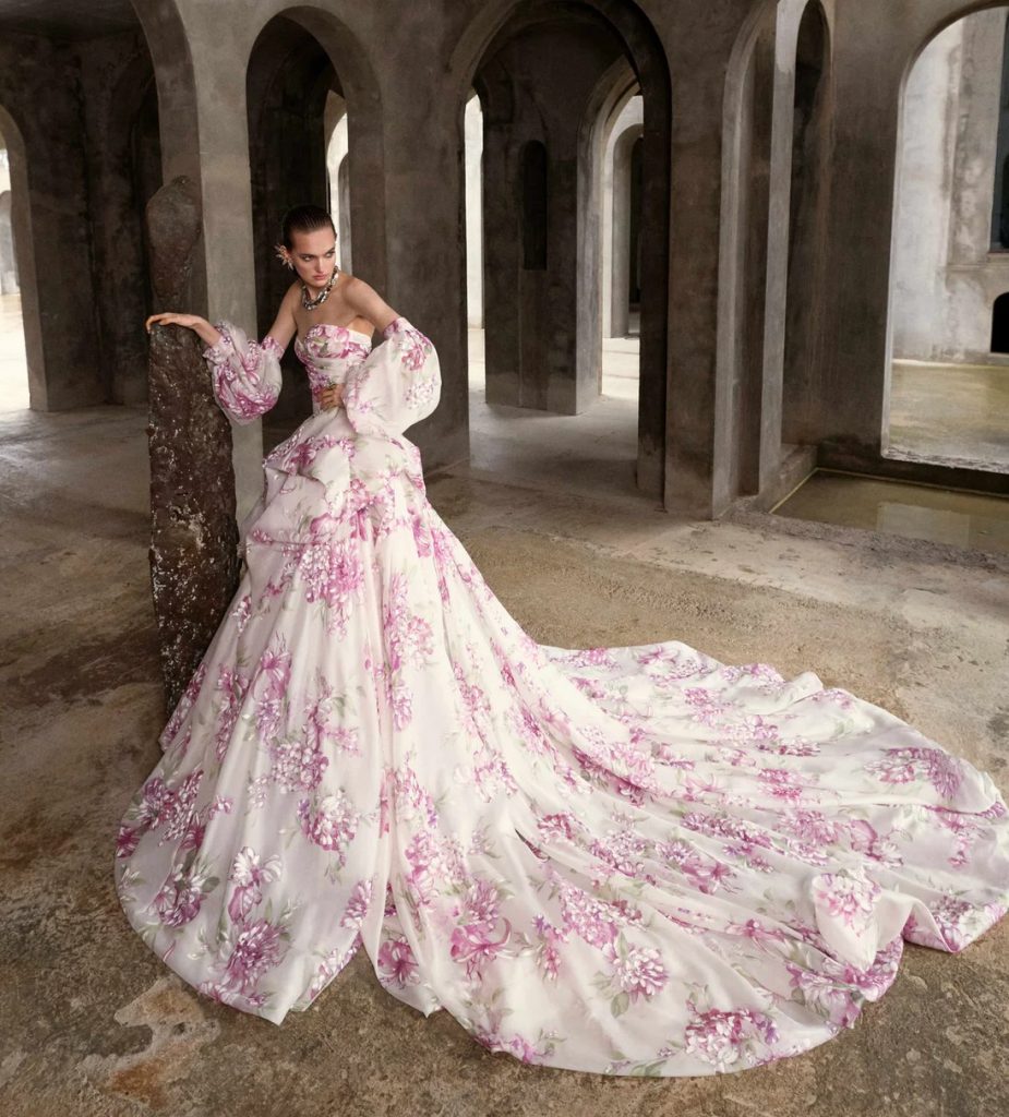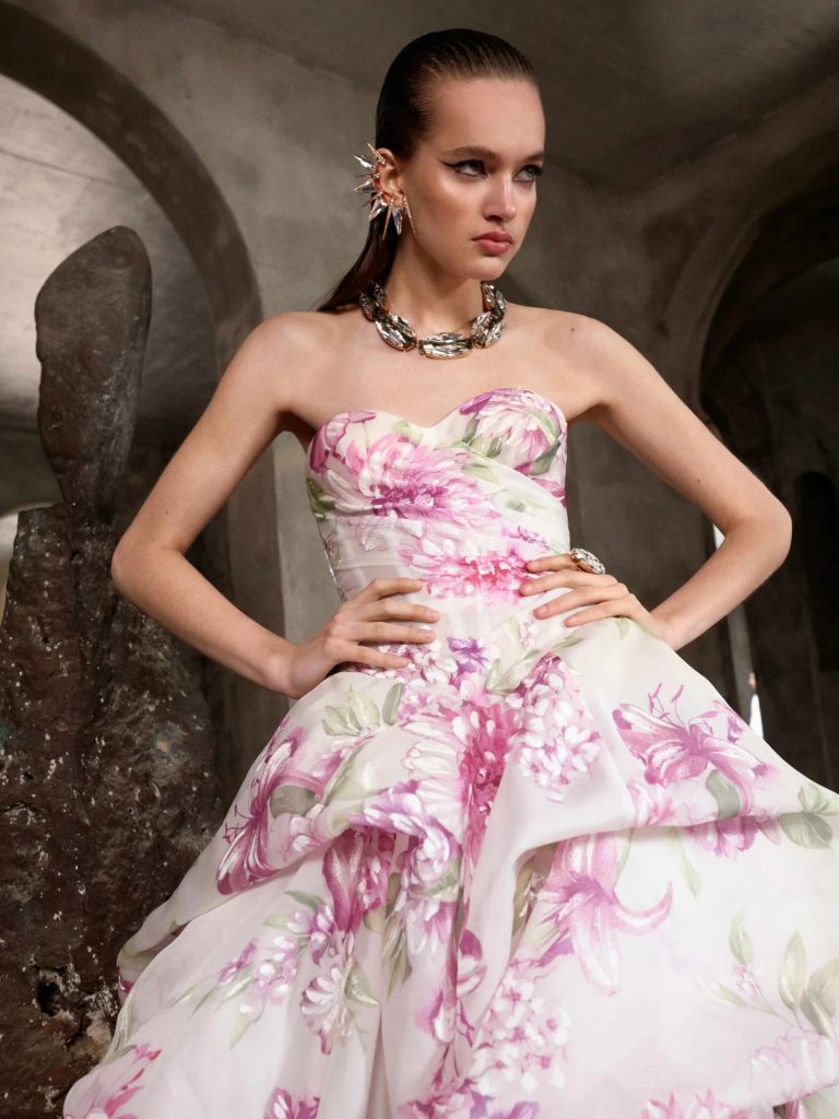 Trionfo del romanticismo con “Fiori”: una sinfonia primaverile prende vita in questo maestoso abito da ballo in organza di seta con stampa floreale, caratterizzato da un top a corsetto drappeggiato con punto vita a V e decorazioni floreali ricamate, che sfocia in una gonna stravagante e voluminosa per un look davvero incantevole.