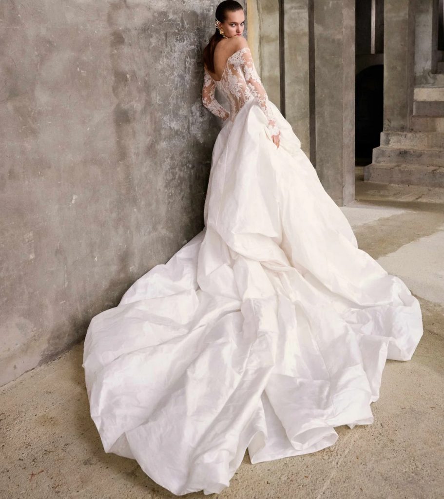 Ammiriamo “Leonora”, un ball gown scenografico e opulento, caratterizzato da un corsetto in pizzo francese a vita bassa con scollatura ad ala d'angelo sulle spalle e maniche aderenti. “Abbinato a una gonna voluminosa in taffetà di seta, questo look è l'epitome del romanticismo regale”, spiega il brand.