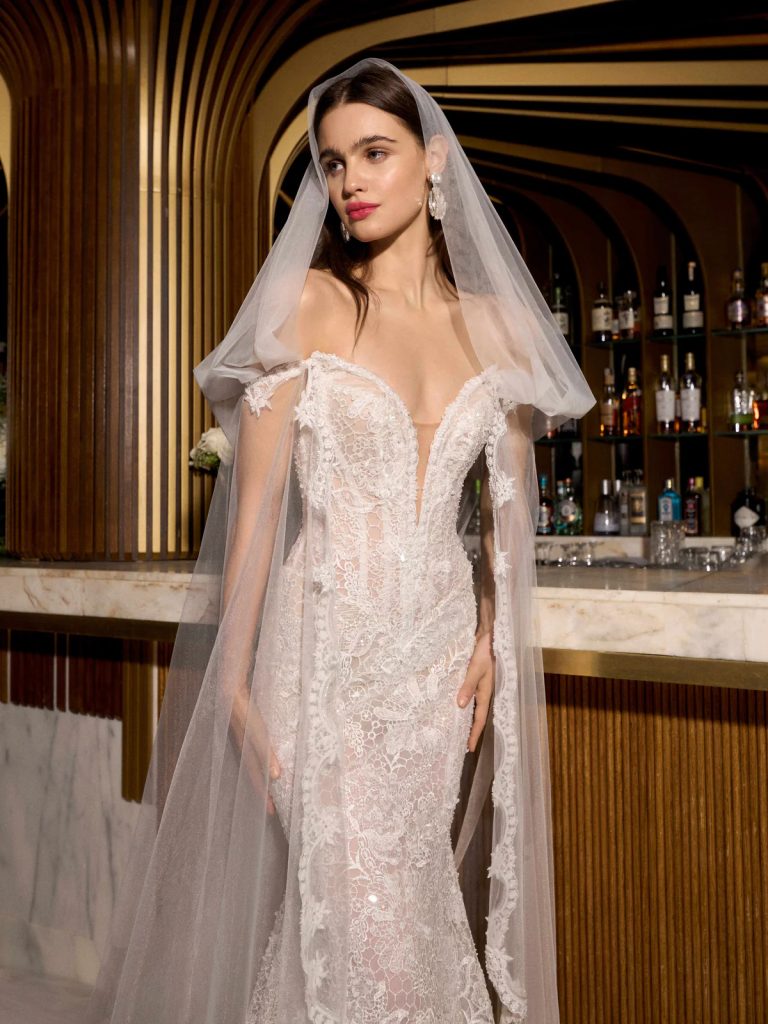 Altro accessorio affascinante è la mantella da sposa: l’abito “Passion”, dalla collezione sposa Galia Lahav Gala Spring 2026, un modello a sirena in guipure con paillettes e profondo corsetto a V glitterato, è avvolto da una sognante mantella in tulle off-the-shoulder con delicate rifiniture in pizzo.