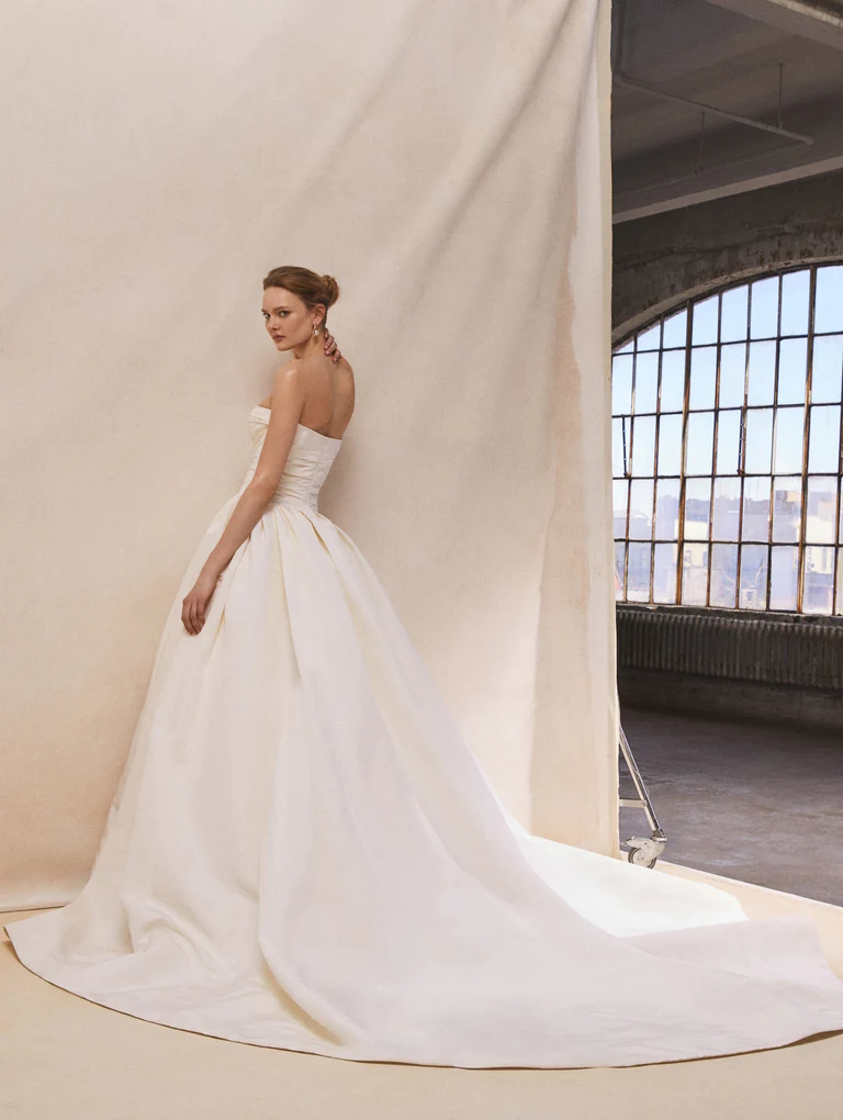 Il cuore della collezione è un voluminoso abito da ballo costruito con strati di petali di tulle a cascata, rifinito con un orlo alto e basso di grande effetto. Scultoreo ma fluido, l'abito è un simbolo potente della dedizione della maison alla grandezza, al romanticismo e all'arte del design nuziale.