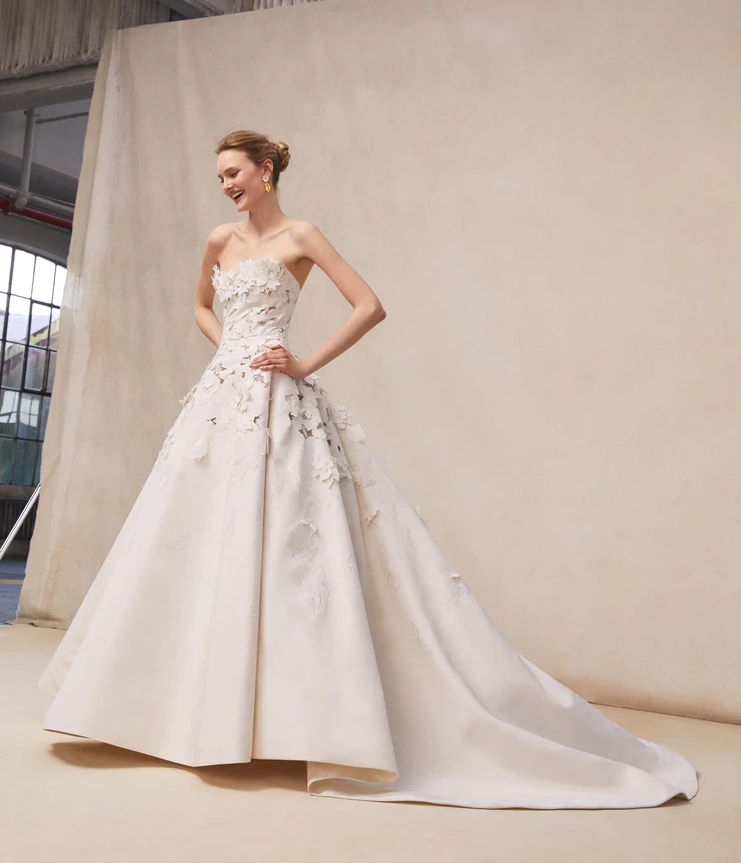 Un trionfo di fiori 3D per la collezione sposa couture Oscar de la Renta Spring 2026: ispirata alla delicata bellezza dei fiori di ciliegio e delle peonie, la collezione reimmagina le silhouette iconiche con riguardo al romanticismo.