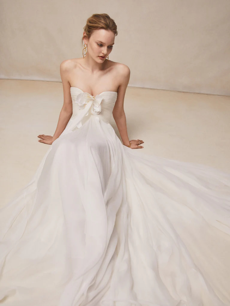 Dallo chiffon leggero come l'aria al faille di seta strutturato, i materiali utilizzati in tutta la collezione mixano la narrazione romantica con una ricchezza tattile.