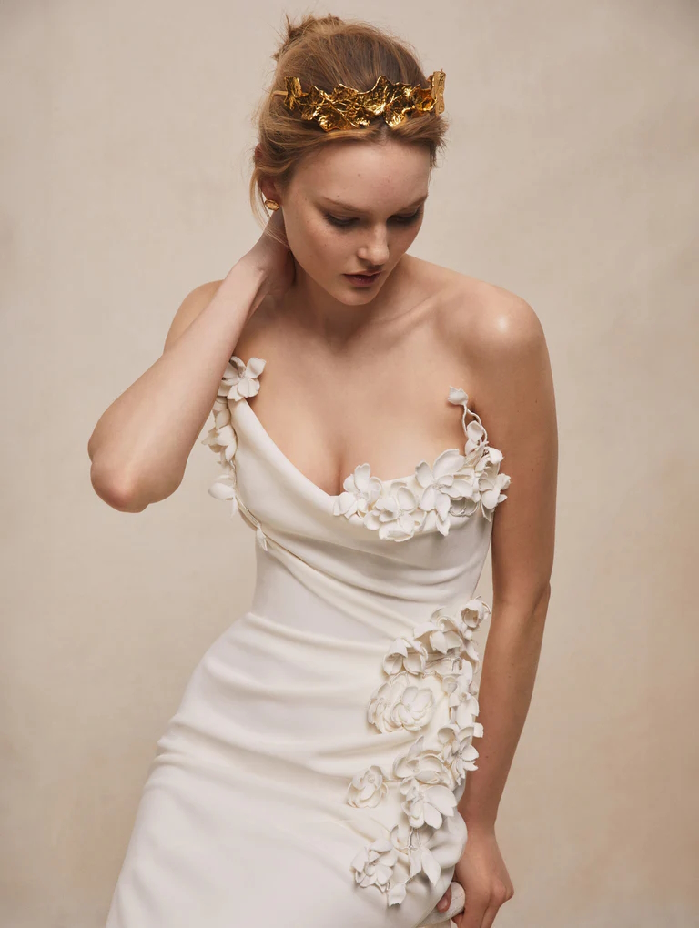 Ammiriamo l’abito da sposa drappeggiato e tagliato in sbieco, che fiorisce con tralci di fiori di ciliegio ad adornare la scollatura a mezzaluna e i fianchi.