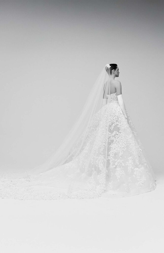 Ricami, pizzi e, come da tradizione per il couturier, anche il raso, impreziosiscono la collezione: “Il raso duchesse è scolpito in un drappeggio meticoloso su preziose scollature a cuore, per poi fluire liberamente in una silhouette solenne. I ricami di cristallo si affermano - sparsi in alcuni punti, densi in altri - e suscitano una brillantezza radiosa”, spiega la maison.