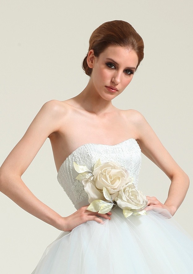 Perfetto per la debuttante come per la sposa anche l'abito “Love” in duchesse satin con applicazioni in pizzo francese e gonna in tulle.