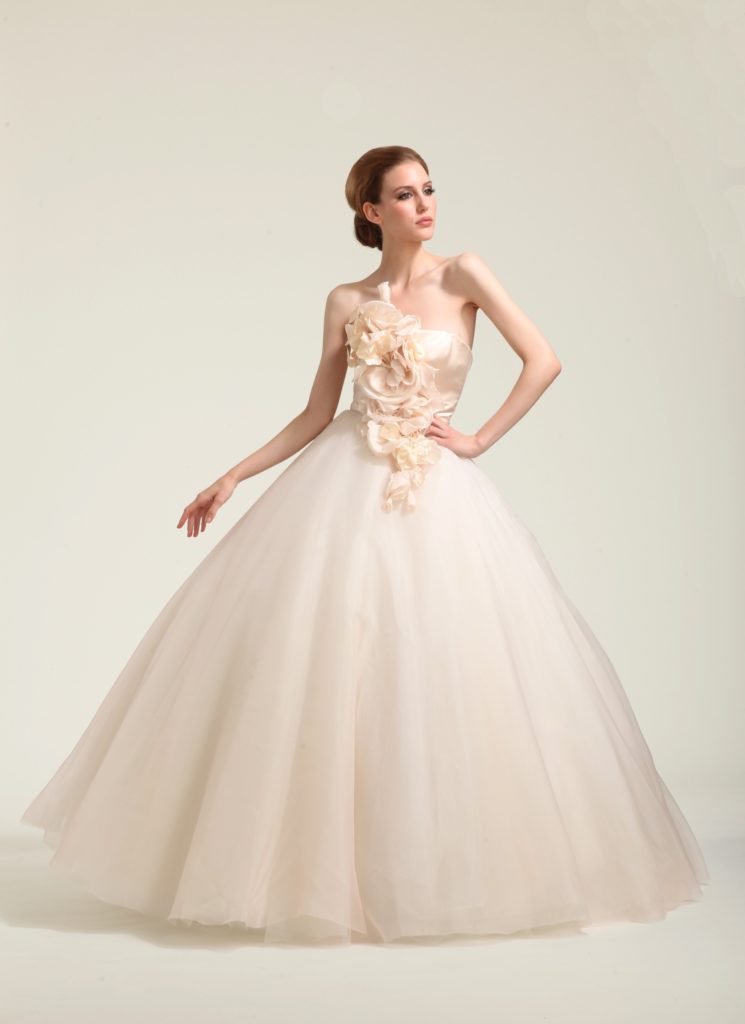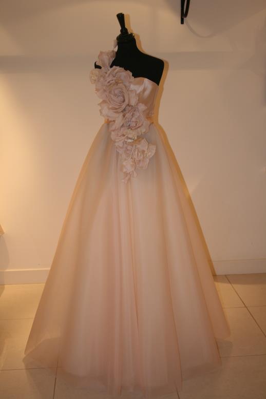 Ecco l'abito color cipria “Blush” in organza con corpetto in satine fiori in seta.