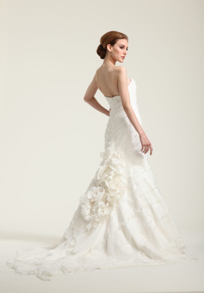L'abito si arricchisce sul retro con uno strato drappeggiato applicato in georgette di seta ed una cascata di fiori in seta.