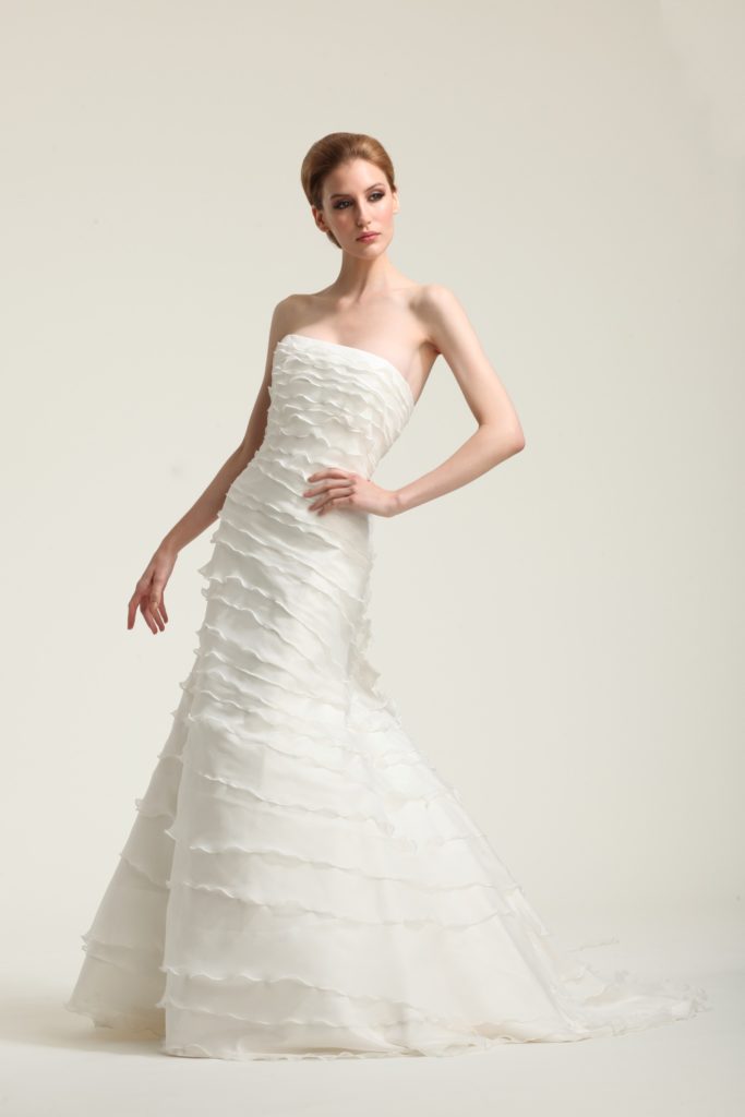 Cominciamo dall'abito a balze “Vivienne”, in duchesse di seta.