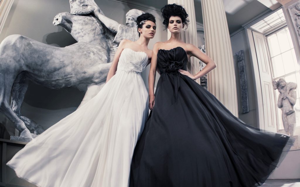 L'abito bianco "Anna May" è in crepe doppiata satin, ha corpetto drappeggiato con lustrini applicati e gonna in chiffon, mentre l'abito da sposa nero "Ava" ha corpetto in duchesse satin e gonna in tulle sovrapposto da chiffon.
