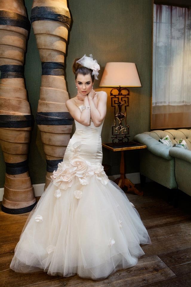 L'abito, in uno splendido rosa cipria, ha busto in duchesse satin, gonna in tulle e una cascata di petali in organza, utilizzata, sempre insieme al tulle, anche per il piccolo copricapo abbinato che vediamo in questa foto di studio.