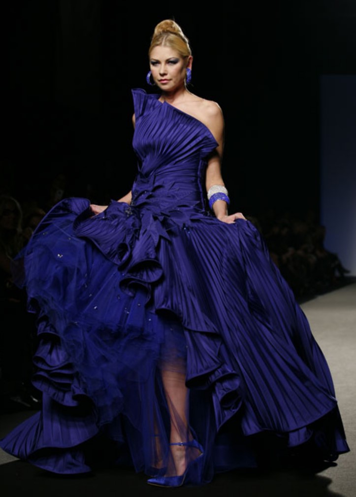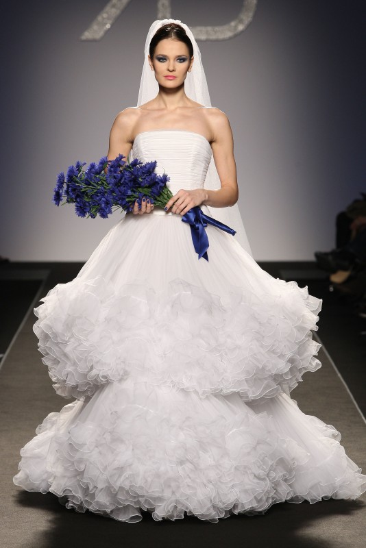 Leggero, ricco, romantico e vaporoso l'abito da sposa della collezione Renato Balestra Primavera Estate 2013  a doppia balza con ruche sull'orlo, presentato in accompagnamento ad un bouquet Blu Balestra.