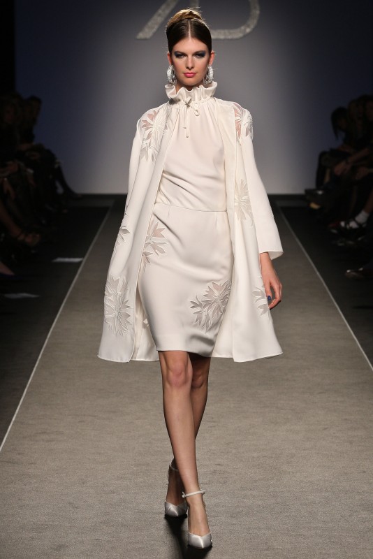 Sofisticata nella collezione Renato Balestra Primavera Estate 2013  anche la proposta per il giorno, in bianco con preziose lavorazioni a fiore, con top con collo a ruche e gonna abbinate ad una morbida mantella.