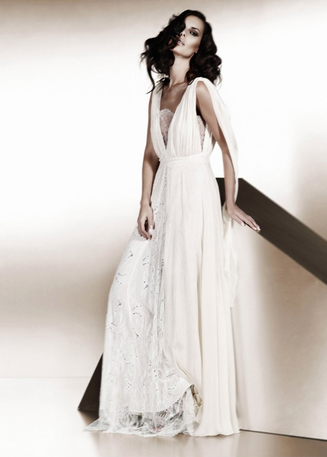 Da un'elegante organza in seta vintage, la stilista ad esempio ha creato questo splendido abito con applicazioni in pizzo e delicati cristalli Swarovski tra le rose, per un insieme davvero sofisticato e romantico.
