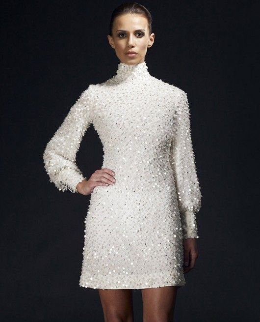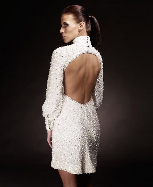 Questo modello corto in seta con paillettes e cristalli Swarovski potrebbe essere perfetto come secondo abito da sposa.