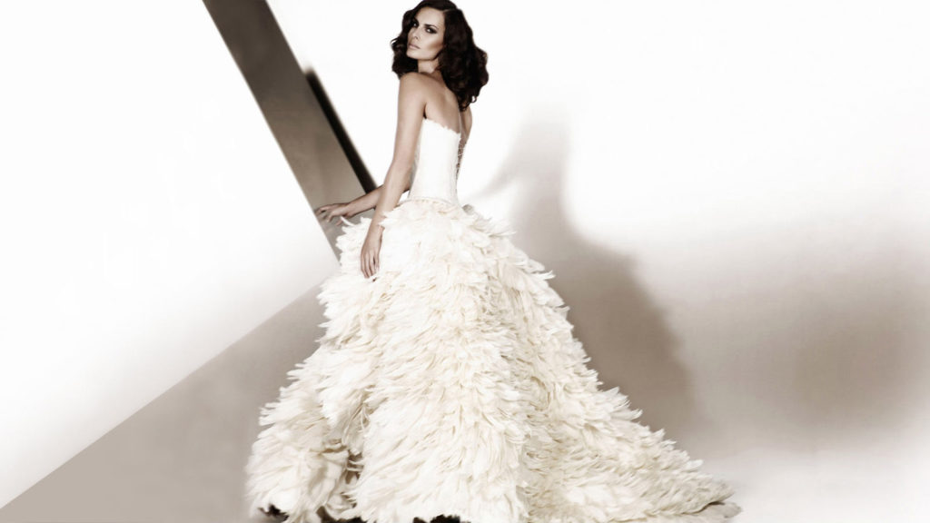Le piume, poi coprono interamente l'abito da sposa a colonna con doppio spacco.