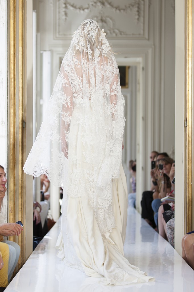 Ecco “Crespin”, lungo abito con ricami in seta e bamboo, inserti in pizzo e velo abbinato in pizzo di Calais e nastri in velluto.