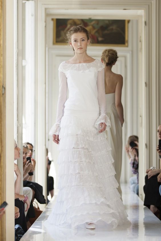 Passando agli anni '70, ispirazione hippie chic per “Gabin”, lungo abito in crepe con balze in cotone ricamato, abbinato a top in tulle di cotone con ricami.