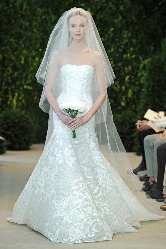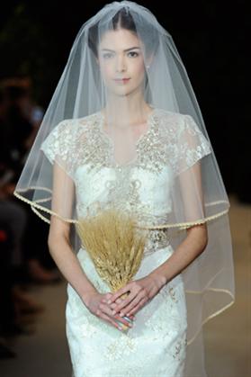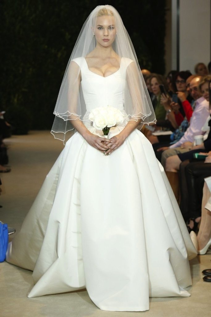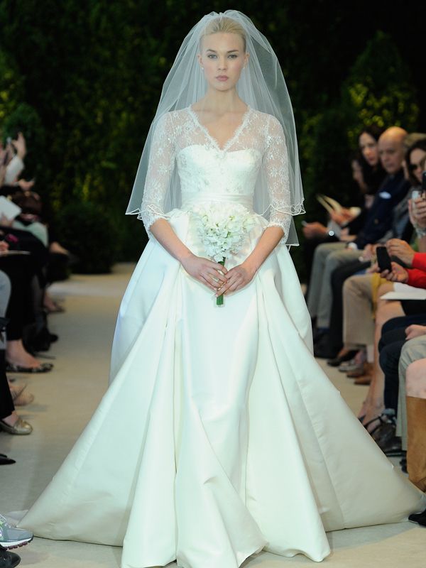Un altro modello off-the-shoulder della collezione sposa Carolina Herrera Spring 2014 è "Andrea", in radzimir di seta e applicazioni in pizzo, con corpetto drappeggiato e lungo velo in tulle bordato in abbinamento.