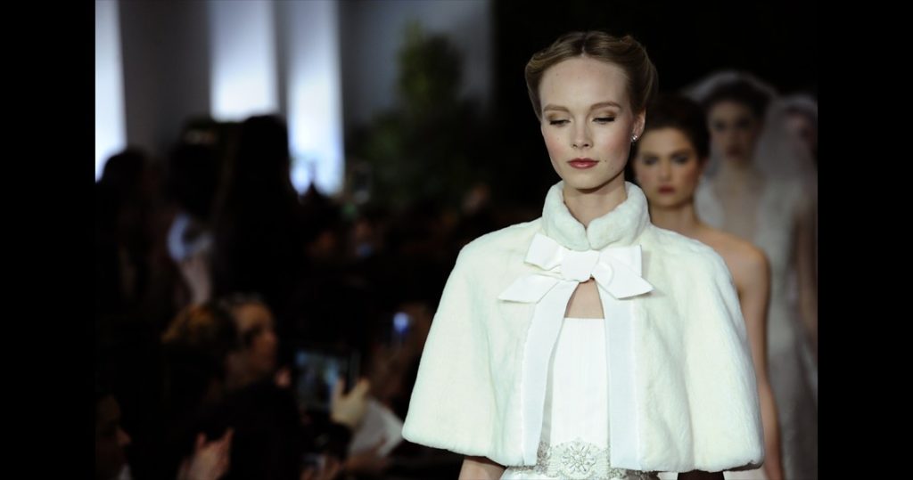 Abbinata all'abito da sposa una mantella in visone racchiusa da un fiocco.